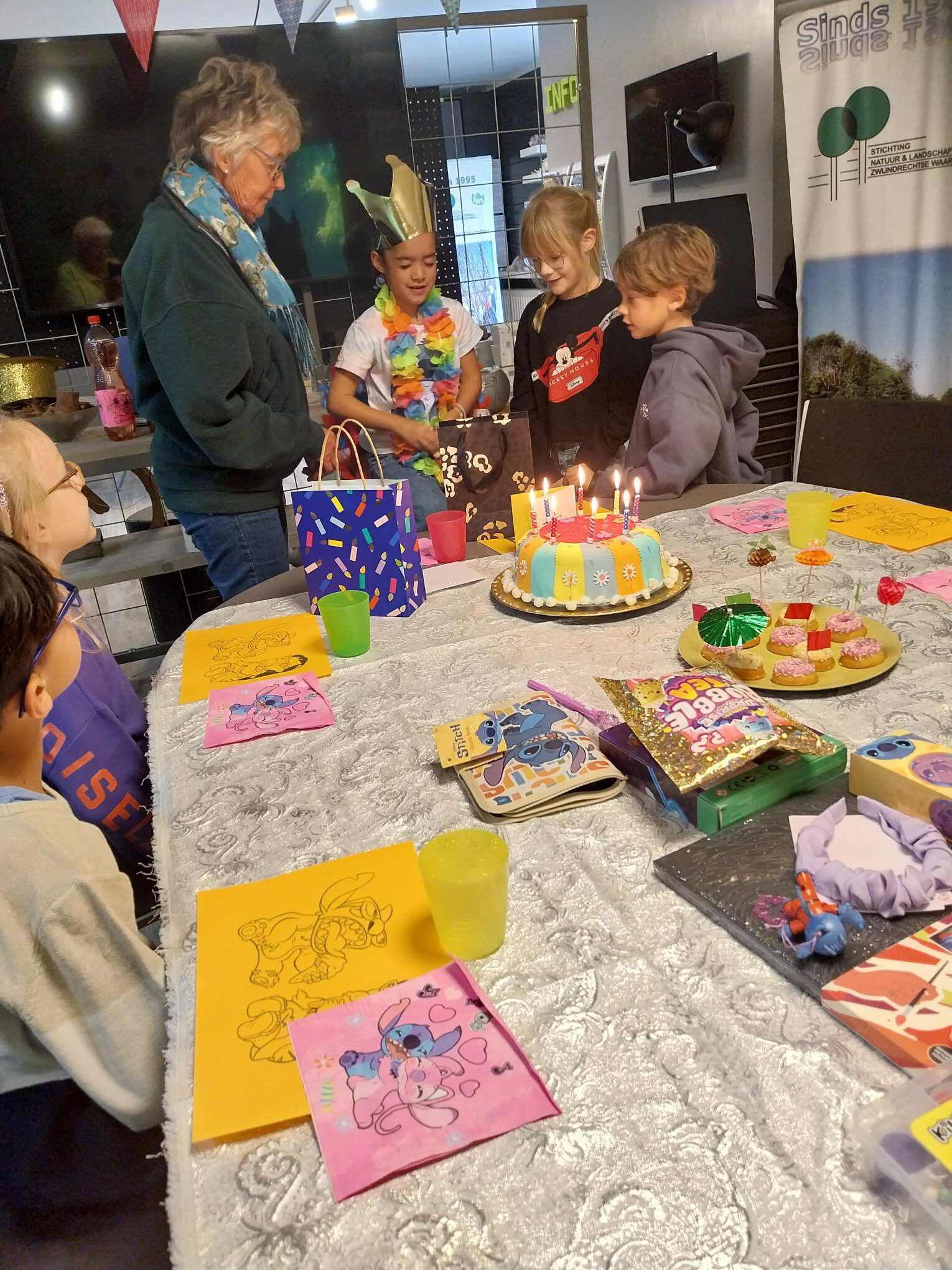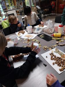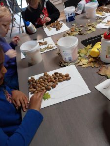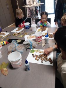 Natuur feestje, vrijdagmiddag 3 oktober 2025. De feestelingen met een mandje in de hand zoeken  in het park naar vruchten en mooi blad. Genoeg eikels te vinden. Binnen een kunstwerk gemaakt van de eikels en het mooie herfstblad. Alle feestelingen met een natuurpaspoort en een kunstwerk naar huis. Feestje geslaagd.