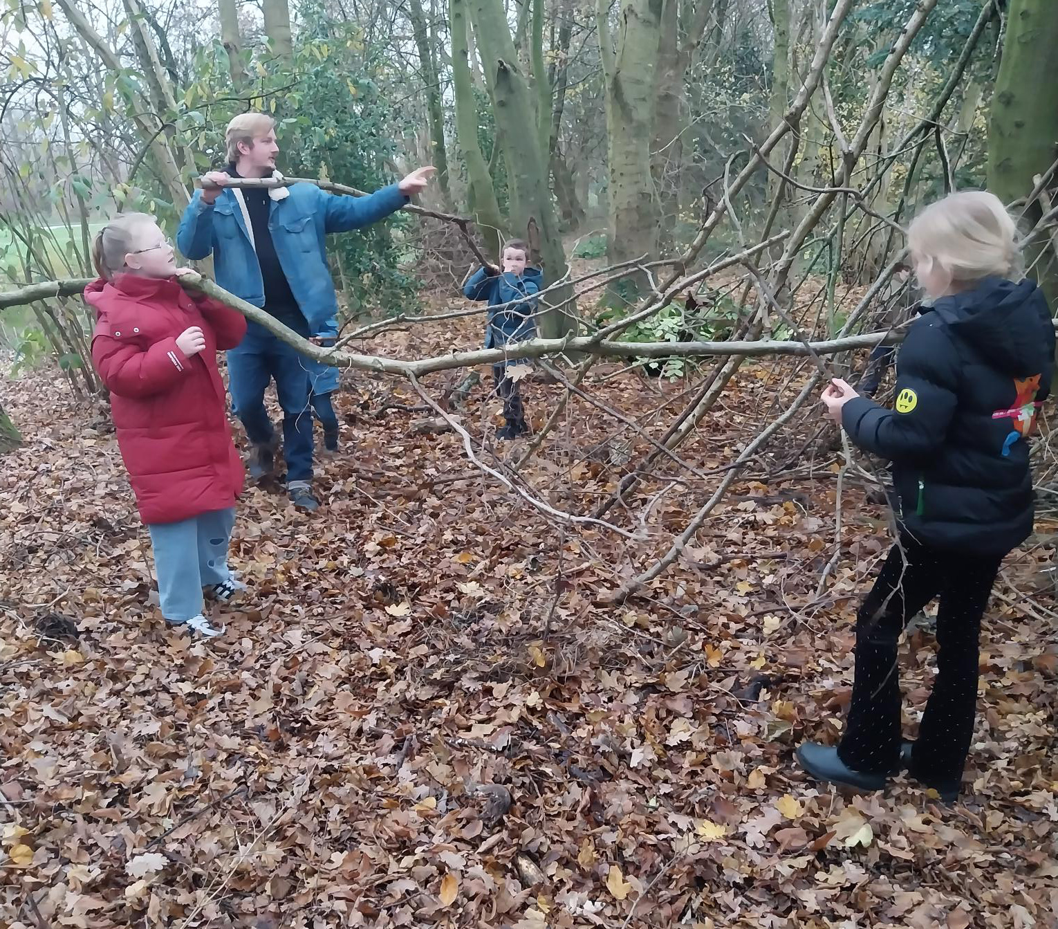 Feestje Jesse in de natuur. 8 stoere boys in de natuur, onthaald met gitaar muziek. Na samen hard werken en takken sjouwen was het einde: “Jel jel jel hutten bouwen kunnen we wel.” De sleutel van de schatkist was het eind spektakel. Feestje geslaagd. Dank aan ’t feest team van ’t Weetpunt, Gosse en Lidy